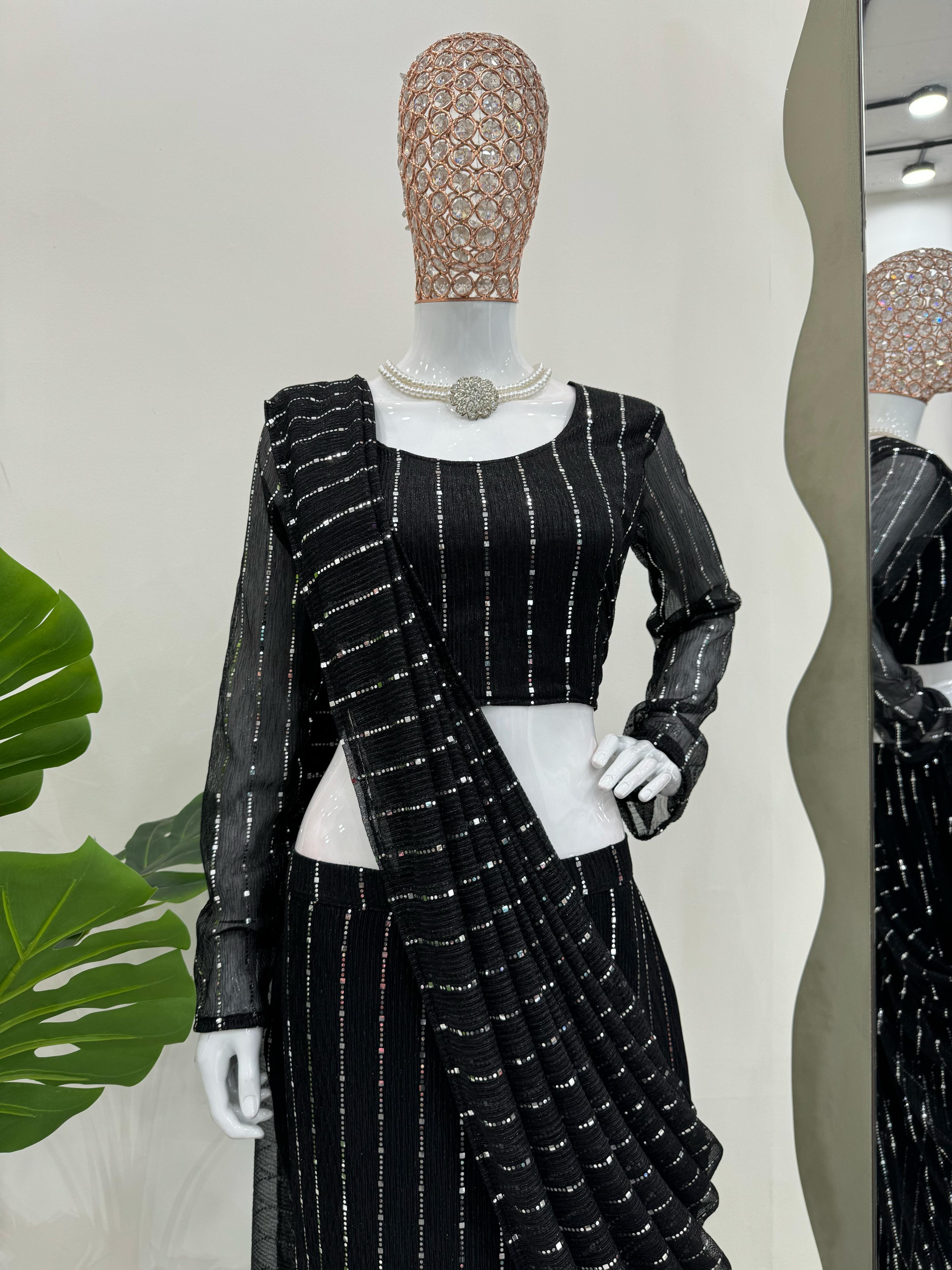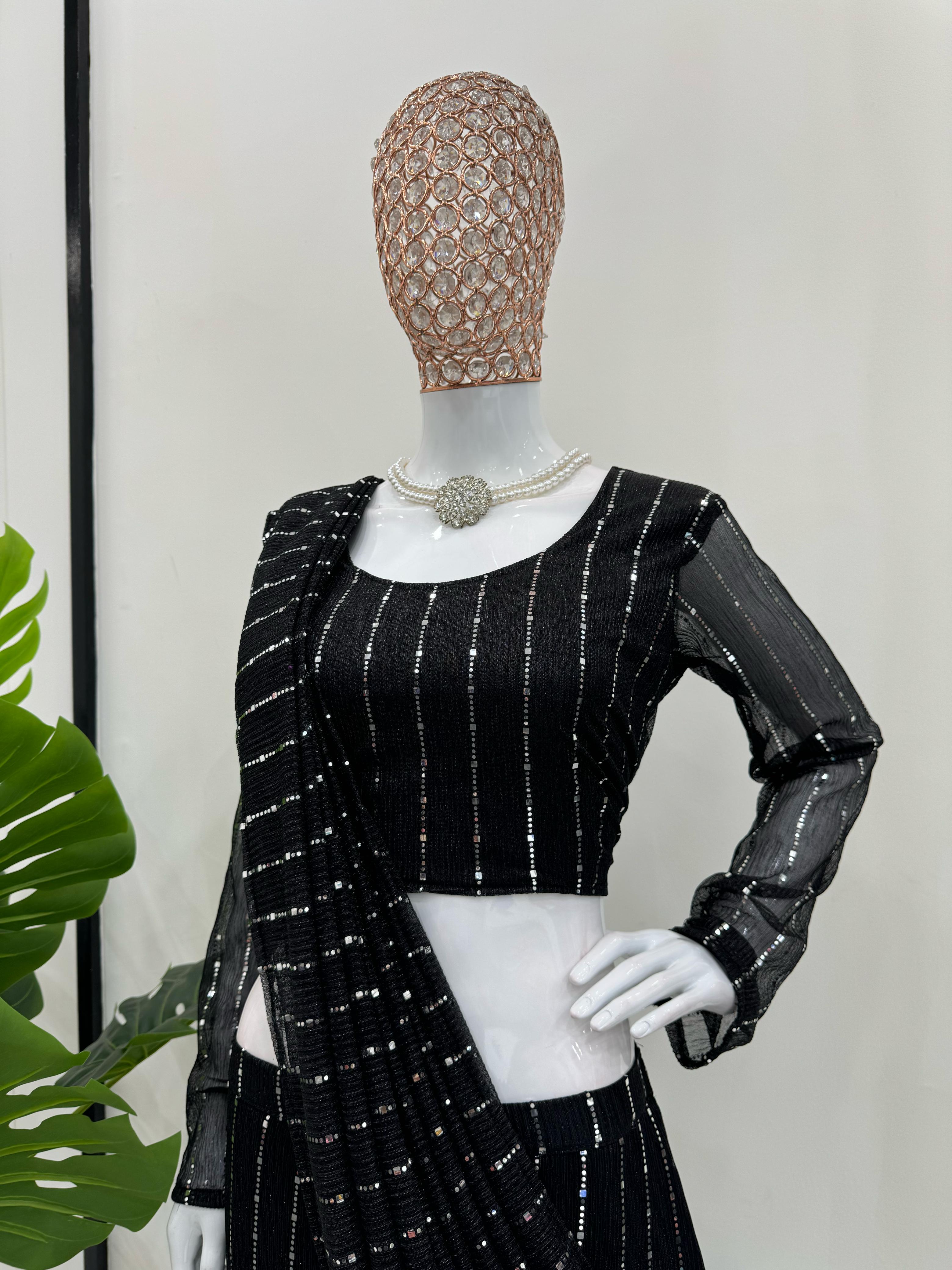Make a stylish statement this season with our trending ready-to-wear lehenga saree – the perfect outfit for weddings, festive functions, or party nights. Designed with a modern drape silhouette and paired with an elegant choli, this set is all about effortless glam.